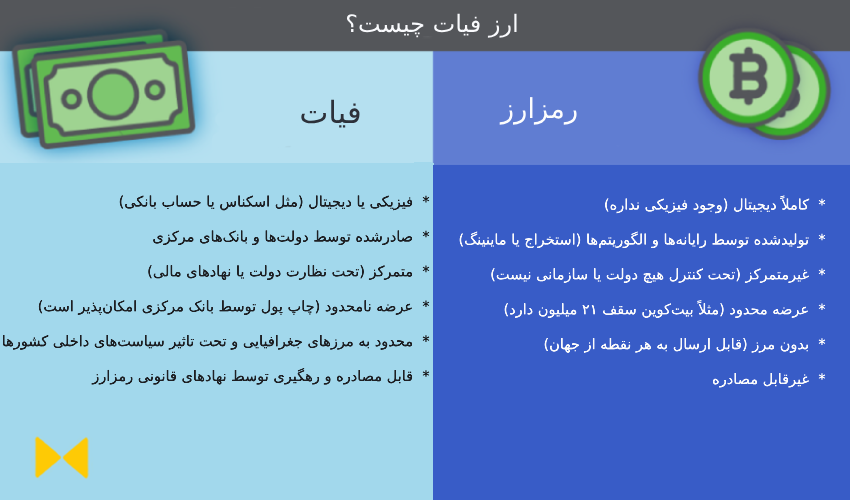 کنترل | توسط دولتها و بانکهای مرکزی | غیرمتمرکز و مبتنی بر شبکه کاربران |